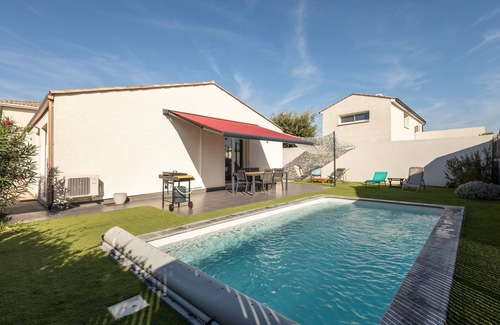 We offer this charming 90 m² air-conditioned house with swimming pool for rent in Vendres, which can accommodate up to 6 travelers. It features a 38 m² living room, a fully-equipped kitchen, three bedrooms, a bathroom and a 350 m² garden. Wifi (fiber optics) included, we're waiting for you!
