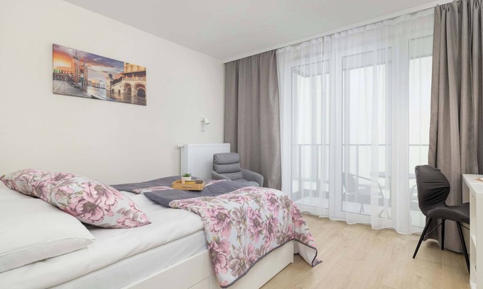 The suite for six people features a bright and elegant design that combines comfort with modern amenities. It features three spacious bedrooms, where each is equipped with a large king-size double bed. In addition, each bedroom has a desk with a chair, creating the perfect environment for remote work. In one of the bedrooms, guests can enjoy direct access to a furnished balcony, which is perfect for morning relaxation outdoors. The fully equipped kitchen offers everything needed to prepare meals, including an electric stove, microwave and dishwasher. A dining area is located in the kitchen. The apartment also provides high-speed WiFi access in each room for uninterrupted internet use. The bathroom is equipped with a set of complimentary toiletries and fresh towels, making your stay more comfortable. The washing machine will certainly come in handy during longer stays. Two parking spaces in the underground garage are also at guests' disposal.