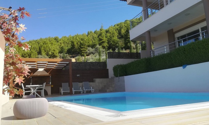 Μια εξοχική βίλλα 99χλμ από την Αθήνα, σε ένα καταπράσινο τοπίο, μόλις 10λεπτα από την θάλασσα με απέραντη θέα σε Ευβοϊκό κόλπο και καταπράσινο βουνό. Προσφέρει ιδιωτική πισίνα και όλες τις ανέσεις, πλήρως εξοπλισμένη. Το μέρος ενδύκνειται για βόλτες και περιήγηση στο βουνό και στη φύση.
