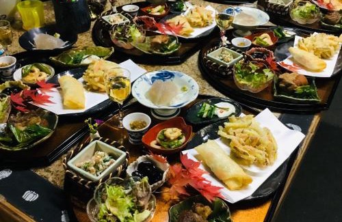 Located in the peaceful countryside with lush greenery and wildflowers, 古民家の宿 ふるま家 Furumaya House Gastronomic Farmstay in Deep Kyoto provides charming Japanese-style guest rooms in a renovated thatched-roof farm house, which is more than 210 years old. This nonsmoking property provides free Wi-Fi and free parking. JR Ayabe Station is a 15-minute bus ride away from the property. For those staying for multiple nights, free pick-up service from the station is also available upon request. Looking out to the gardens, one unit is fitted with tatami (woven-straw) flooring and traditional futon bedding. A low table and seating cushions are included, and bathroom and toilet are shared with other guests. House Furumaya provides laundry facilities and free-use bicycles for guests’ convenience. Barbecue facilities are available at an additional charge with an advance request. The property offers hearty homemade dinner made with local ingredients in the dining room, where guests can sit around the fireplace.