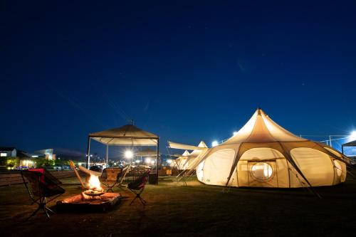 13 miles from Hashihime Inari Daimyojin Shrine in Uno, 瀬戸内温泉たまの湯キャンプ場 offers accommodations with access to a hot spring bath, spa facilities, and public bath. This luxury tent features an open-air bath, a garden, and barbecue facilities. There's a restaurant serving Japanese cuisine, and free private parking is available. The luxury tent provides certain units with sea views, and all units have a shared bathroom. Sogenji Temple is 14 miles from the luxury tent, while Mizushima Ryokuchi Fukuda Park is 16 miles away. Okayama Airport is 24 miles from the property.