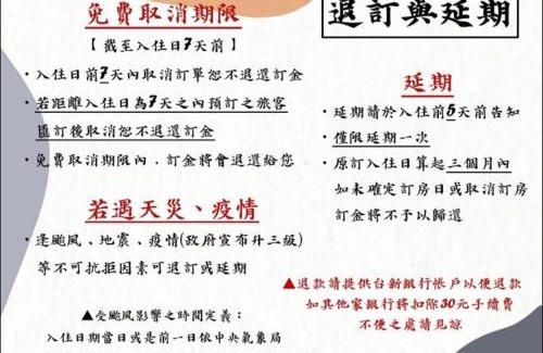 Based on the information reported by the owner or manager, details for the cancellation policy for the 綠色的日子 are as follows: Cancellation policy Guests are cautioned that the cancellation policy may differ based on seasonality, availability, or current travel restrictions. Guests should also be aware that this policy may be subject to change and should be confirmed prior to booking. More details may be available on this page in the property description. However, early check-in or late check-out can sometimes be negotiated between the guest and the owner or the manager of this property.