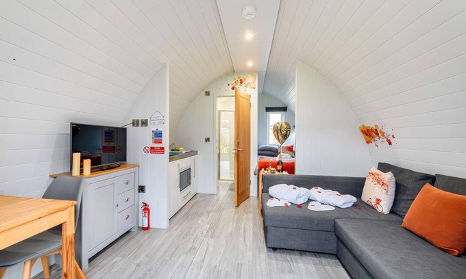 Dreaming of a romantic getaway, sharing a hot tub under the stars, relaxing together on the outdoor comfy sofa, then look no further. We have put together the ingredients to make your dreams come true, the only thing we can’t guarantee is the weather, but a break in our luxury pods will make you feel like dancing in the rain, whatever the weather! Our beautiful pods offer all you need for that perfect get away, luxury shower room, 2 TVs, equipped kitchen with fridge and microwave, comfy sofa and double bed. A decked porch area with two steps leads down from the French doors to your private all-weather area where you can enjoy al fresco dining with and of course enjoy your own personal outdoor hot tub. And if that’s not enough to temp you, all this is set in 30 acres of landscaped grounds with views of Bredon Hill, The Malvern Hills and The Cotswolds. Although we are in the heart of the countryside, we are only 10 miles from Worcester, 20 miles from Cheltenham and 20 miles from Stratford Upon Avon, so should you wish to venture out you are well placed. Whether it’s a full week or a long weekend, we have everything covered for an idyllic break from life’s hustle and bustle. Each of our pods have thick insulation to keep you warm in the winter chill and cool in the summer heat with excellent heating and temperature control. Step inside the double-glazed French doors into a spacious and open plan room with a ’boutique hotel style’ feel, here you will find a gorgeous comfy sofa with scatter cushions and throws to snuggle up in, a fully made-up double bed with crisp white linen, a TV with built in DVD, and stunning views to nature reserve. There is plenty of space to hang your clothes and unpack your bags. Our fully fitted kitchen area has everything you need from utensils, pots and pans, crockery, glasses, cutlery and not forgetting the all-important bottle opener with corkscrew. There is also a Toaster, Kettle, Microwave, Fridge, and a two-ring induction hob. At the far end of the pod is the en suite shower room with a very spacious shower, white fluffy towels and complimentary toiletries are included, we also supply a hairdryer. No pets.. Bowbrook Lodges is a quiet and unspoilt location which offers cosy lodges to quirky glamping safari tents. Take a walk down to Bowbrook and walk through the meadow, relax, and unwind whilst appreciating the views to The Cotswolds and Malvern Hills. Sheep are often roaming in the surrounding fields.