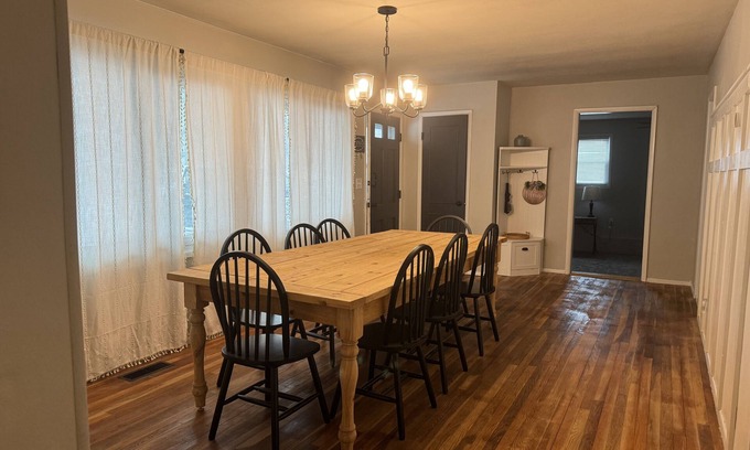 Perfect for family getaways or group trips, this fully equipped home offers everything you need for a memorable stay. Relax in the large living room, cook up a feast in the well-equipped kitchen, or gather around the dining table for game nights. Pack-n-play, high chair, and toys available upon request. This house is the perfect home base for exploring the university, nearby parks, restaurants, and shops.