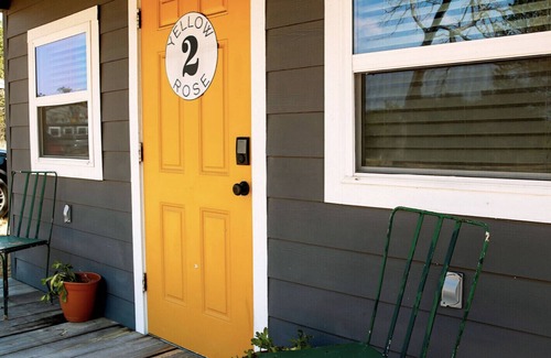 Newly constructed 300 sq ft cottage w/ modern amenities and a industrial theme, quietly nestled on an old farm road on the outskirts of Round Top, TX with KEYLESS entry (no keys to hassle with). The Yellow Rose Cottage was designed for comfort with our guest in mind. Yellow Rose has a full bathroom with a spacious stand-up shower and "on-demand" hot water along with a queen size bed and a futon that can sleep one extra. The kitchenette has a mini fridge/freezer with a Keurig coffee pot and a 2 person table for dining. 4200 sq ft Beer & Wine Garden on premise serving craft and domestic beer along with a variety of wine. Note: We have a total of 5 Cottages on the property for larger parties. Please Contact Eva for more information.