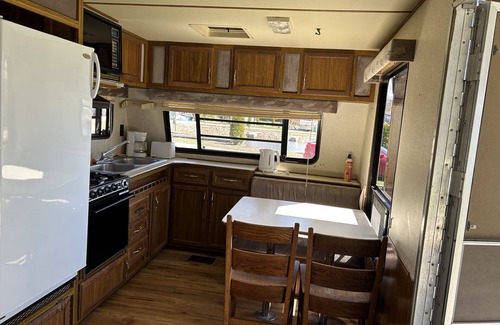 This spacious Classic trailer has a separate Master bedroom with a queen bed. The combination living and kitchen area has pull down sofa suitable for one adult sleeping arrangements . An excellent feature of this site is the large covered deck, perfect for outdoor dining. 3 piece trailer size bathroom.