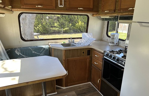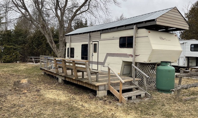 Bayview is nestled on a cozy site directly across from the docks. This RV boasts a large built on deck with bench area , outdoor picnic table, bbq with propane and a fire pit . Ideal for a family with small children or 3. Enjoy an Indoor kitchen , separate bedroom with queen bed and ample storage space . 3 piece trailer size bathroom .