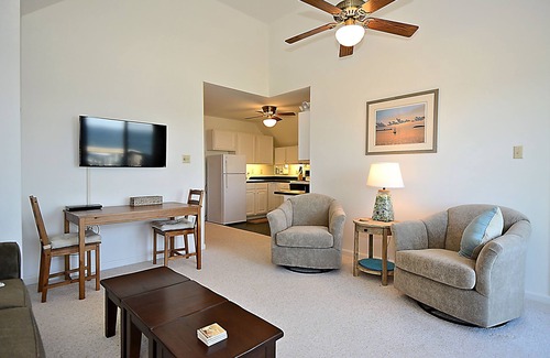 On the 2nd floor there are 3 bedrooms: a master bedroom (queen size) with an HDTV and a private bath, a queen bedroom, and a room with a full size bed. In the upstairs family room there is a queen sleep sofa and a twin convertible ottoman bed, for an upstairs sleeping capacity of nine. There is a 2nd floor hall bath with a tub/shower. Bed linens, towels, beach towels, and laundry detergent are provided. There is independent air conditioning on each floor.