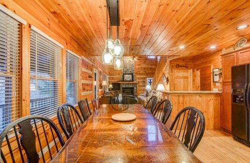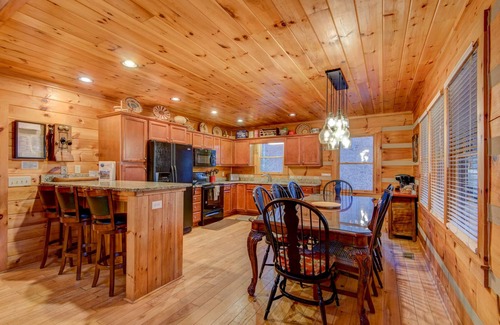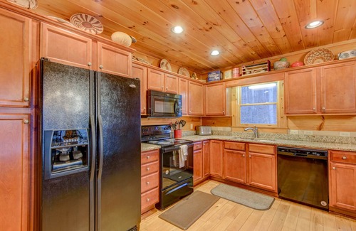 The main level contains a delightfully furnished living room with leather sofas, gas-log, stone fireplace, vaulted ceilings, and 32-inch cable HDTV with DVD player, a covered deck with rockers, a bedroom with two queen-sized beds and cable TV, a bedroom with a bunk bed, twin on top, full underneath, and a teepee playhouse for kids plus a TV, a full bathroom, a dining area, and kitchen. The kitchen has been stocked with everything you need, whether you're preparing a large group meal or a romantic dinner for two.