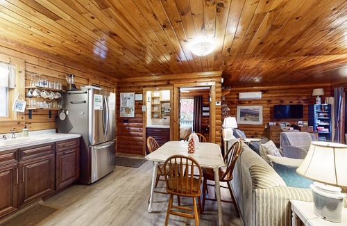 Swim, fish, and rock-hound along the shores, or simply sit back and take in the breathtaking waterfront views at this Seneca Lake log cabin. Offering an authentic taste of the Finger Lakes, this rustic one-acre retreat sits along 50 feet of direct lake frontage and boasts private highlights like a large deck, a dock, and a hot tub. Board games, books, and art supplies are also provided for low-key family fun. You'll be within easy reach of a public boat launch, along with several local wineries along the popular Wine Trail.
