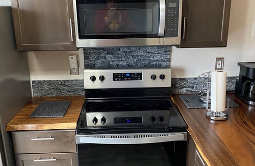 This is a clean, beautiful apartment with two bedrooms, one bathroom, living room, fully remodeled kitchen with a range, microwave, refrigerator, dishwasher, coffee maker, Ninja Grill Foodie, Nutria Bullet, cookware, dinnerware, glassware, mugs, and storage containers. The kitchen has an island with bar stools. The unit also has a balcony with an outside grill and griddle. Additionally, there is a storage room with a washer and dryer and a chest freezer for storing frozen items during extended stays.