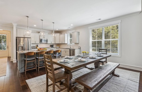 The gourmet kitchen is a chef's dream, featuring granite countertops, stainless steel appliances, and all the tools needed to create memorable meals. Adjacent dining areas provide ample room for large gatherings, with seating for 16+ guests.