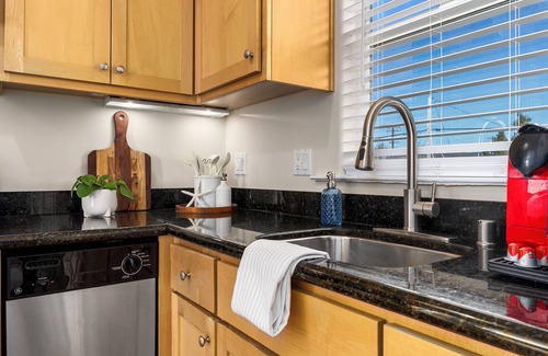 Experience the best of Santa Cruz living in this beautifully designed, fully furnished 1-bedroom, 1-bathroom home with an additional office space. Designed by Thatcher & Thompson, this two-story residence features a bright and airy beachy modern aesthetic with trendy coastal decor, stylish furnishings, and thoughtful design touches throughout. High ceilings and large windows flood the space with natural light, enhancing the open and inviting feel. The custom kitchen boasts granite countertops, sleek cabinetry, a spacious pantry, stainless steel appliances, and even an espresso maker for your morning coffee ritual.