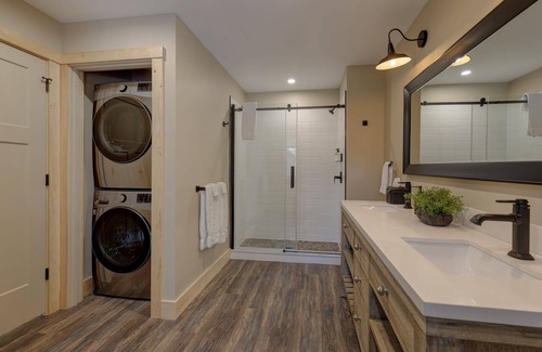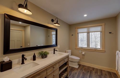 This modern rustic two-level suite comprises one bedroom, two bathrooms, and a sofa bed. The interior is adorned with hickory log furniture, shiplap vaulted ceilings, and plush Adirondack-style furnishings, creating an ambiance conducive to relaxation after a day of outdoor adventures. The bathrooms offer a sanctuary of their own, featuring a pebble stone shower surrounded by subway tiles and a personal bidet toilet for added comfort.