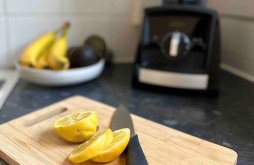 The kitchen has a fridge freezer, hob, oven, grill, Cuisinart steamer, Vitamix blender and Oscar VitalMAX cold press juicer.