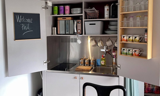 This is a luxuriously appointed private guesthouse, with complete privacy from the garden (blinds at all the windows) with a fully operational kitchenette. Facilities include: fridge, microwave, 2 ring hob, kettle, toaster, coffee machine, and sink, along with all the plates, crockery and pans etc to enable you to cook during your stay. If you don't choose to cook, there are food shops and restaurants a 2-3 minute walk from the property, including a Co-op mini-market. Restaurants cater for Turkish, Thai, Indian, Dominos, Fish and Chips, Chinese, Italian and just about everything you could hope for.