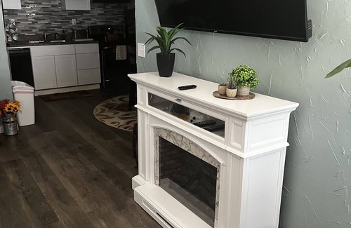 Living room with 62”inch Roku TV, WiFi, heat/AC unit operated by remote control, fireplace operated by remote control, ceiling fan, leather sofa and recliner.