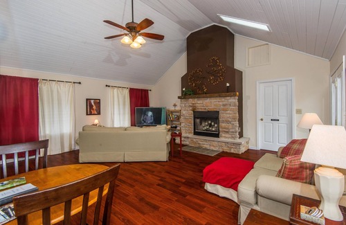 Once you’ve parked the car and headed toward the house, the covered porch is the first place you will be tempted to sit and enjoy the view of the pretty yard and woods surrounding the cottage. As you come into the house, there’s a bright and cheerful living room all decked out in beige and red, with a stone wood-burning fireplace (duraflame logs only and NOT provided) centered on the main wall. The tongue and groove cathedral ceiling adds a lot of rustic character, and French doors bring in loads of natural light, while providing access to the expansive deck on the back side of the house. Your fully-equipped kitchen extends off the living room, and the open design means that not a word of conversation, or a view of the winning touchdown on the big screen TV will be missed just because someone went to the kitchen for a snack. Pretty cabinetry, a stainless steel side-by-side fridge/freezer, dishwasher, and smooth-top range offers all the conveniences you likely left back home…but isn’t it more fun playing house in a different location? We certainly think so!