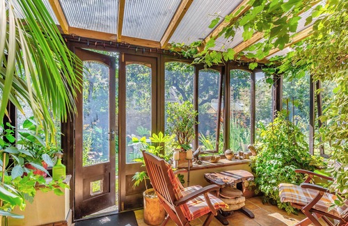 The farmhouse-style kitchen/diner is well-equipped with everything to cater and benefits from another dining table and set of French doors out onto the garden. A freezer, washing machine and tumble dryer can be found in a building outside the property. A modern shower room and another family bathroom with a shower over the bath can be found on this level. Upstairs houses a king-size bedroom with en-suite toilet and a stunning Juliet balcony with views of the garden and surrounding rolling countryside. This gorgeous traditional English lawned garden with plenty of mature foliage and stunning flowers is the perfect place for al fresco dining long into the evening. The stone wall surrounding the garden keeps the space private and enclosed.
