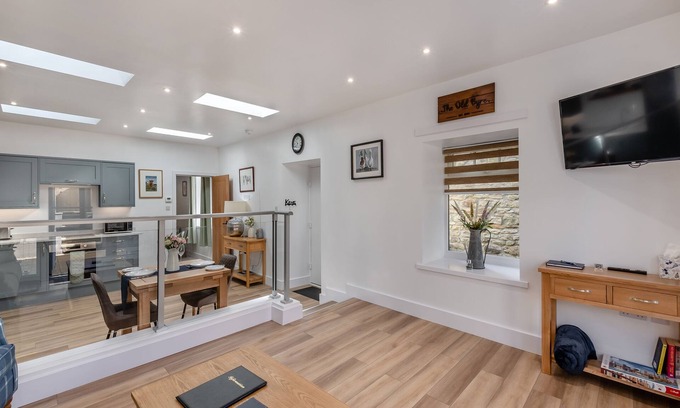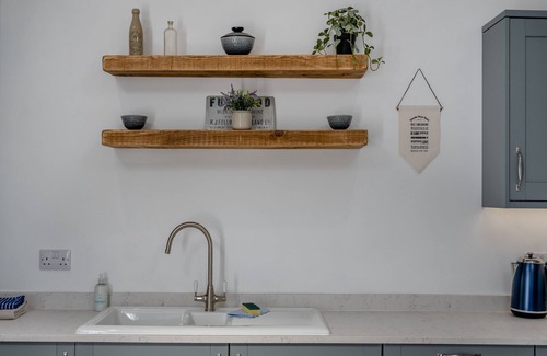 Bathroom: Bath, Cubicle Shower, Heated Towel Rail, Toilet. Oil central heating, electricity, bed linen, towels and Wi-Fi included. Highchair. Welcome pack. Enclosed back garden with garden furniture. Hot tub (private). Private parking for 1 car. No smoking.. Discover the epitome of serenity in this meticulously renovated barn conversion, a hidden gem boasting unrivalled luxury. This one-level haven offers easy access and is crafted to an exceptionally high standard, ensuring your escape is nothing short of extraordinary. As you enter into this enchanting retreat, be welcomed by a step up into the lounge area, adorned with a comfortable sofa, chair, and a Smart TV for your entertainment. French doors open to reveal your private garden oasis, complete with a hot tub and a seating area, inviting you to unwind in blissful seclusion. The open-plan kitchen and dining room, a modern culinary haven equipped with all the modern appliances to make your stay hassle free.