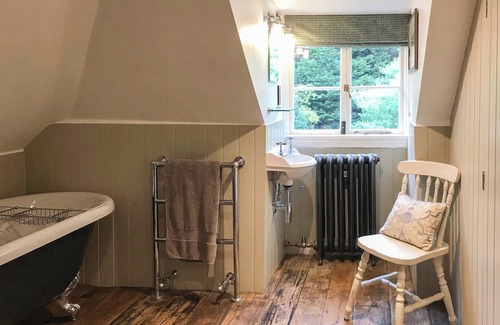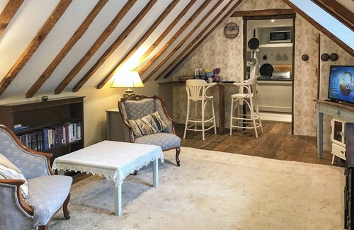 Bathroom: Roll Top Bath With Shower Attachment, Toilet. Electric central heating, electricity, bed linen, towels and Wi-Fi included. Cot and highchair available on request. Welcome pack. Bike store. Private parking for 2 cars. No smoking.. The loft provides a private and well-equipped space with parking, separate entrance and self-contained amenities. Original features such as beams, roof trusses, doors, floorboards and staircase blend seamlessly with modern comforts. Please note that access is via a steep narrow staircase with restricted head height, making the loft unsuitable for wheelchair users or individuals with mobility issues. Guests are welcome to bring their travel cot/toddler bed and can request a highchair. The owner thoughtfully provides complementary shampoo, essentials and a hairdryer.
