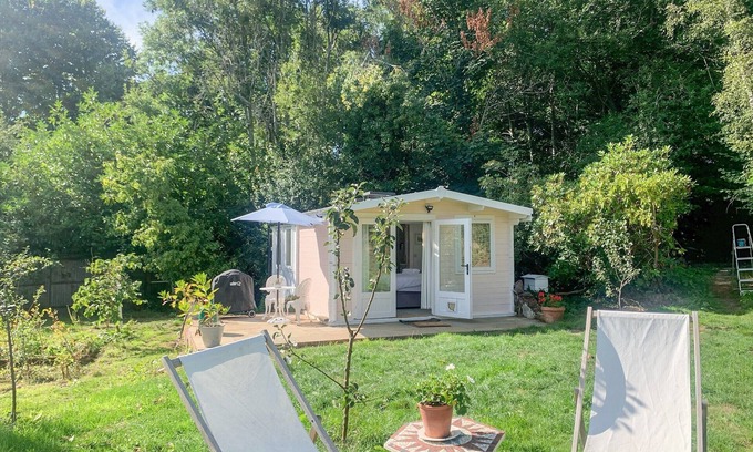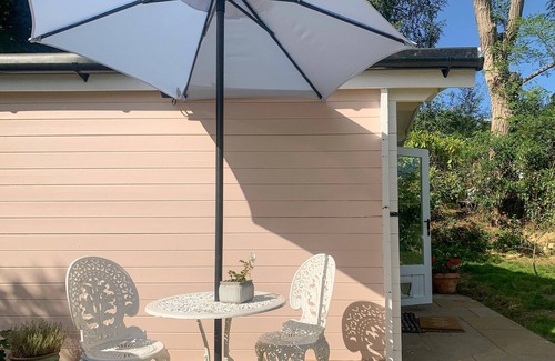 Shower Room: Walk-In Shower, Toilet. Calor Gas central heating, electricity, bed linen, towels and Wi-Fi included. Welcome pack. Front garden with patio, garden furniture, barbecue and patio heater. Private parking for 1 car. No smoking.. The Chalet offers a secluded spot perfect for relaxing for both humans and dogs alike, this enchanting property is tucked away at the end of the owners’ garden at a lower level with trees and a sheltered side pathway dividing the areas for privacy. Overlooking a large lawn which will be yours to enjoy. The Chalet also benefits from a south facing patio area with seating, a patio heater and a BBQ for all occasions.
