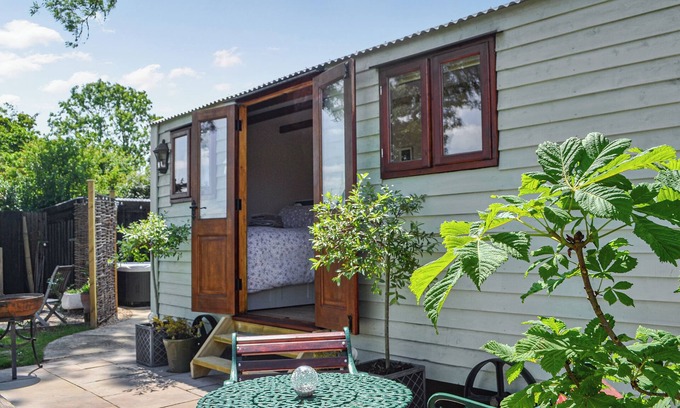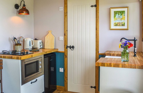 Shower Room: Cubicle Shower, Toilet. LPG central heating, gas, electricity, bed linen and towels included. Welcome pack. . Front garden with sitting-out area, garden furniture and BBQ. Hot tub (private). Private parking for 1 car. No smoking.. Wildflower View is a fabulous shepherd’s hut which can be found nestled in the grounds of a converted old Victorian village school in the tranquil rural setting. It lies midway between the villages of Gembling and Foston on the Wolds and inland from the seaside village of Skipsea on the beautiful East Riding of Yorkshire coastline. This shepherd’s hut is perfect as a base for two looking for a romantic and relaxing break away surrounded by stunning countryside. Step inside and discover the traditional open plan living that it offers. A sumptuous kingsize bed sits to onside and is slightly elevated to allow for great views out across the open fields. The country style kitchen is a delight. The fold-down table is just the perfect place for enjoying a hearty breakfast or for a romantic evening meal. The accommodation is completed by the bathroom complete with a Victorian-style toilet and shower. Wildflower View takes its name from the lovely garden, boasting areas of wild flowers and a hot tub. Enjoy an evening surrounded by bubbles watching the sun set over the Yorkshire Wolds.