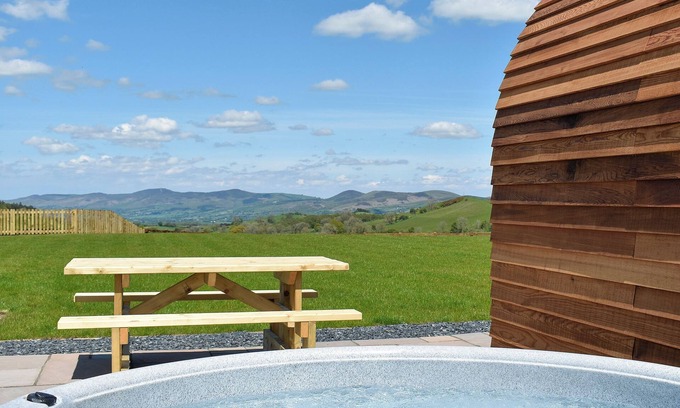 Bedroom 2: Bunk (3ft) Beds. LPG central heating, gas, electricity, bed linen, towels and Wi-Fi included. Welcome pack.. Patio area. Hot tub for 6 (private). 2 dogs welcome, to be kept on a lead at all times (sheep country). Private parking for 1 car. No smoking. Please note: This property has a natural water supply from a borehole. This property has a security deposit of £100.. These stylish, detached, contemporary pods enjoy an idyllic, elevated location in the small village of Llanelidan with far reaching, Welsh countryside views. Set on a working sheep farm, they benefit from an open-plan living space and walk-in shower providing everything you need for a comfortable glamping experience. The comfortable bedroom area features a double bed with sumptuous bedding, giving you a fabulously refreshing night’s sleep; the separate bunk room is perfect for children. The well-equipped kitchen will provide you with everything you need to create a traditional Welsh breakfast ready to take on the day ahead - try visiting the local Rhug Estate for your fresh local milk, bread, and fresh meats. Before you retire at the end of the day, relax on your patio to take in the spectacular views as the sun dips behind the mountains or wake early to have a dip in your private hot tub before the start of a brand-new day of adventure.