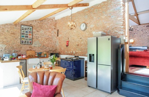 Bathroom: Bath With Shower Attachment, Heated Towel Rail, Toilet. Underfloor heating in bathroom, electricity, bed linen, towels and Wi-Fi included. Travel cot, highchair and fireguard. Welcome pack. Enclosed lawned back garden with sitting out area and garden furniture. 2 dogs welcome, to be kept on a lead (sheep country). Private parking for 2 cars. No smoking. . Parish Land Barn is a stunning, detached barn conversion located on the owners’ land. It is very spacious and full of character and comprises accommodation on three separate mini levels, with a few steps in between each room. The whole property benefits from very high ceilings and a real sense of space yet retains a very cosy countryside feel. There is an open plan living/bedroom area with a Smart TV, fantastic wood burner-style open fireplace at one end and a kingsize bed at the other. Step down a few steps and find yourself in the large kitchen/diner area with French doors that lead out onto the south facing enclosed lawned garden with lovely countryside views.
