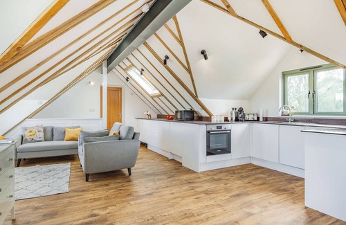 Bathroom: Bath, Wet Room, Shower, Heated Towel Rail, Toilet. Electric underfloor heating, electricity, bed linen, towels and Wi-Fi included. Welcome pack. Front garden with patio and garden furniture (shared). 1 dog welcome, to be kept on a lead at all times. Electric vehicle charging point, at cost. Private parking for 1 car. No smoking.. This brand new (in 2022), loft-style, first floor apartment is set above the on-site farm shop on a fruit farm in the Essex countryside, and provides fabulous holiday accommodation, perfect for a couple looking to get away for a short break or week long stay. The open-plan living space boasts a kingsize bed, with a defined living and dining area, and a well-equipped kitchen. The bathroom gives you the choice of a relaxing soak in the large bath or a quick shower under a rainfall shower. Russets is set within a fruit farm where you can pick your own plums in season, or purchase some of the delicious local honey on offer.