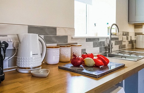 Relax in the inviting living room, where you’ll find soft seating, electric flame-effect fire, Smart TV, and lovely local scenic artwork on the walls. The fully equipped kitchen includes electric oven, dishwasher, fridge with freezer compartment, microwave, coffee pod machine, with a welcome pack of biscuits, tea, coffee, and milk to greet you.