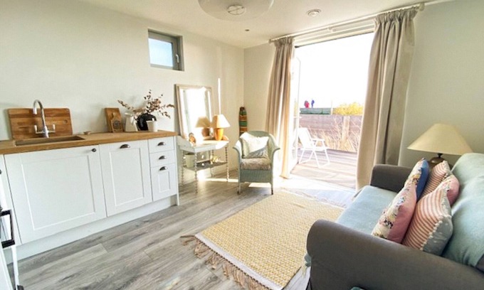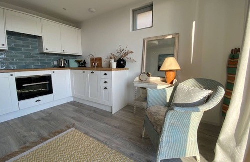 Shower Room: Walk-In Shower, Toilet. Electric central heating, electricity, bed linen, towels and Wi-Fi included. Front garden with sitting-out area, firepit and barbecue. Bike store. On road parking. No smoking. . This self-contained one-bedroom annexe looks out to the beachfront and decked patio area, the perfect spot from where you can watch the sunset on a summer’s evening or even dine outside al fresco style. The property has a living room with a Smart TV, a fully fitted kitchen and it has its own modern bathroom with walk in shower.
