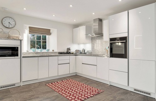 Bedroom: Kingsize (5ft) Bed. Electric central heating, electricity, bed linen, towels and Wi-Fi included. Initial logs for wood burner included. Highchair. Enclosed patio. Private parking for 3 cars. No smoking.. Scandinavian style, ultra-efficient wood burner and downstairs underfloor heating are there to ensure a cosy stay. A wonderful locally crafted kitchen with A-frame beams a granite work surface, high tech NEFF cooker and hob, and all the items you need to relax and prepare gourmet meals. The house is decorated throughout to the highest standards enhanced by an abundance of wonderful soft furnishings. Smart TV with Sky (movies package) and swift Wi-Fi. The house has one bedroom set on a mezzanine, the flick of a switch obscures the glass to make it a private and luxurious bedroom, with electric blinds to enhance the feel.