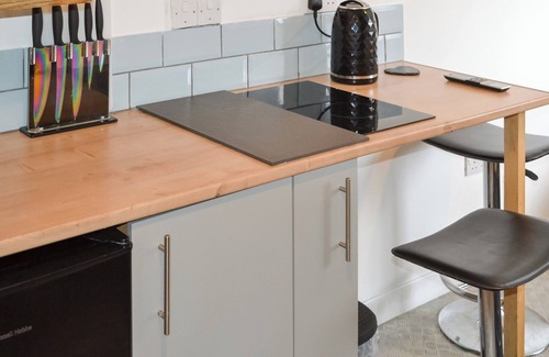 Kitchen area: With electric hob, microwave and fridge/freezer.