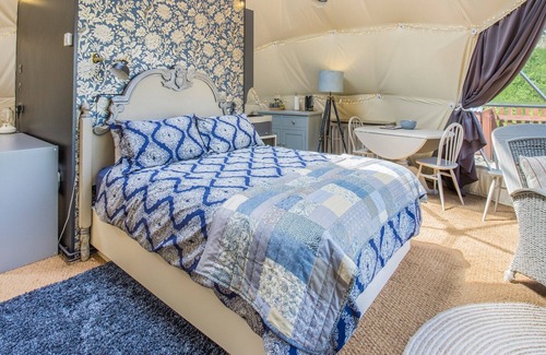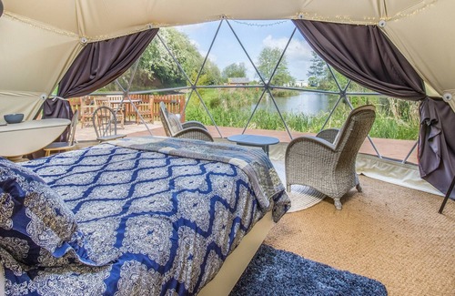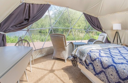 Shower room: With shower cubicle, toilet and heated towel rail.. Gas central heating, electricity, bed linen, towels and fuel for wood burner included. Welcome pack. Private patio with garden furniture, barbecue (charcoal) and firepit. Barbecue hut with bar, pig roast burner, pizza oven and garden furniture (shared with other properties on-site, charges apply). Private parking for 1 car. No smoking. Please note: There is an unfenced lake in the grounds. . Shropshire Glamping is the perfect place to relax and enjoy the stunning countryside. All the accommodation is designed, built, and individually styled with luxury furnishings and fixtures. The Geo Dome, Summerhouse and Kingfisher Pod are set around the lake, each with their own view and where the huge variety of interesting geese and birdlife gather, including a Kingfisher family, Grebe, and Tufted Ducks. Whether you’re looking for a romantic getaway, a friend’s trip or a dog-friendly vacation, The Geodesic Dome sits boldly on decking at the far side of the lake, has a huge picture window giving way to the lovely views of the lake and the resident wildlife. The large clear roof panel allows you to gaze at the night stars. Individually furnished and with the best view to wake up to all areas are fully covered with coir carpet and there is a fabulous wood burning stove which is fuelled with logs from the owner’s sawmill. The dome has a fully integrated bathroom pod, with enclosed shower, basin, and toilet.