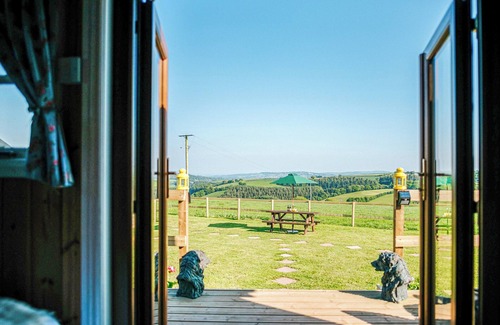 Bedroom area: Super Kingsize (6ft) Bed. Electric and gas central heating, electricity, bed linen, towels and Wi-Fi included. Welcome pack. External kitchen with electric oven, gas hob, fridge, dishwasher and washing machine. External shower room with shower cubicle and toilet. Garden with multiple decked areas, garden furniture and barbecue hut. 100 acre grounds with pastureland. Wood-fired hot tub for 2 (private). Private parking. Please note: The property has a natural water supply from a spring. No children, except babes in arms. No pets. . A truly magical site, perched over a gorgeous valley which is home home to a large herd of red deer. This truly unique holiday accommodation offers an array of facilities, including a grand barbecue hut with ample seating, an outdoor wood-fired hot tub, filled with the farm’s own spring water and with glorious views over the valley below.