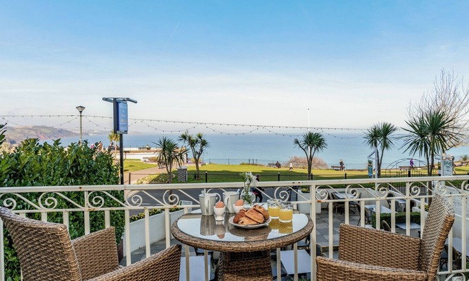 A beautifully furnished ground floor studio apartment with a terrace overlooking Babbacombe Beach.. 2 steps to entrance.