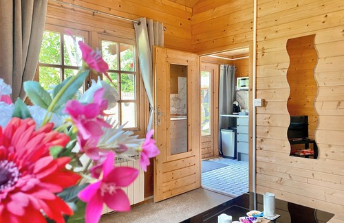 Shower Room: Walk-In Shower, Toilet. Electric central heating, electricity, bed linen, towels and Wi-Fi included. Welcome pack. Front garden with sitting out area and garden furniture. Hot tub for 4 (private). Private parking for 1 car. No smoking. Please note: There are 2 steps in garden.. Welcome to The Cabin! Newly renovated to a high standard, with private off-road parking and separate to the main house, this luxury cabin with kitchen, living room, bedroom and shower room boasts everything you need for a relaxing stay, including your own private and secluded Jacuzzi hot tub! Set amongst fruit trees and flanked on one side by our lovely wild pond and on the other by the hot tub decking area, our lovely log cabin is waiting to welcome you for a relaxing stay. The kitchen is fully fitted with everything you will need to cook up a storm, along with T towels and washing up liquid. Our cosy living room includes a TV with free access to both Netflix and YouTube and we have both wired internet and very fast Wi-fi. The bedroom has a lovely comfortable double bed and supplied with bed linen, towels, and robes for the hot tub. In the spacious en-suite bathroom you will find a huge walk-in shower and a cupboard along with two wall mirrors. Outside the cabin is your private sitting area with a bistro set and 2 egg chairs. To the right is the large Jacuzzi hot tub, set in the middle of the decking with it’s own bar area and table and chairs. You will have sole use of the whole area, as the other buildings are just for storage.