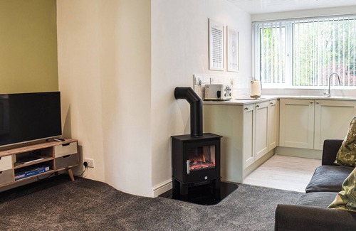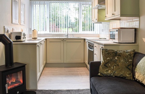 Bedroom: Kingsize (5ft) Bed Ensuite: Walk-In Shower, Toilet. Electric central heating, electricity, bed linen, towels and Wi-Fi included. . Private parking for 1 car. No smoking. Please note: This property has a natural water supply via borehole.. The open plan layout of this modern cottage lends itself perfectly to a couple looking for a romantic getaway or an outdoor pursuits break. The entrance opens into the dining area which offers great views of the surrounding woodland as you enjoy a well-prepared meal. Beyond that is the living area which is the ideal spot to relax in front of the fire or TV, after an enjoyable day’s walking, cycling, climbing, or just sightseeing in the Lakes. The kitchen is well appointed with all the amenities you need to prepare anything from a pack lunch to a romantic meal for two. The bedroom is a good size with a king-size bed and has an ensuite with walk in shower, to gently massage those aching muscles after a busy day.