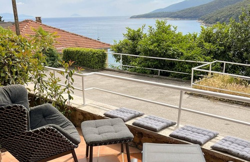 Located in the attractive town of Rabac, known for its beautiful pebble beaches and crystal clear sea, this practically furnished apartment offers everything for a feel-good vacation. It is located in a family house on the slope of a hill, which overlooks the beach and promenade, and has a fantastic view of the bay. The convenient location allows you to listen to the lapping of the sea on the beach during the day or to admire the riot of colors of the various stalls in the town in the evening. Charming hiking trails lead to the historic town of Labin, where you will be spoiled with local specialties and quality wine in many small restaurants, konobas and cafes.