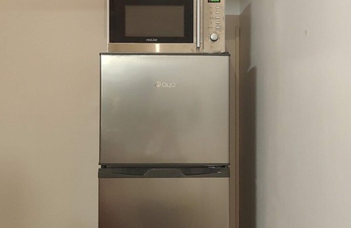 - The kitchen area is separated on the living room. It is equipped with a microwave, an electric oven and a fridge, hotplates, coffee maker, kettle