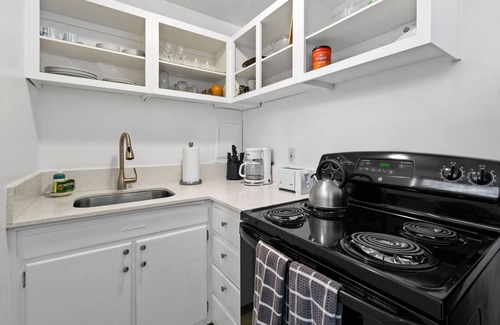 Modern beach chic boutique apartment with a touch of old school Florida. Sleeps 2 on a comfy kind size bed. Separate bathroom with spacious living room that connects to the dining area. Full kitchen includes place setting for 2, starter kit of (paper towels, toilet paper, soap), tableware and cookware.
