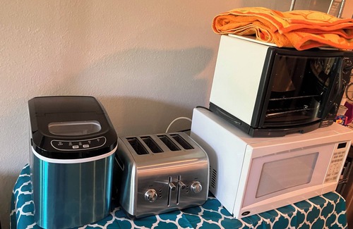 -Electric Stove/Oven, Dishwasher, Refrigerator, 2 Microwaves, a Toaster Oven, Ice-Maker, two coffee makers, coffee grinder and a 4 Slice Toaster. Plus plenty of cabinet space.
