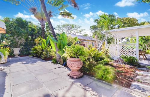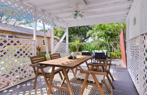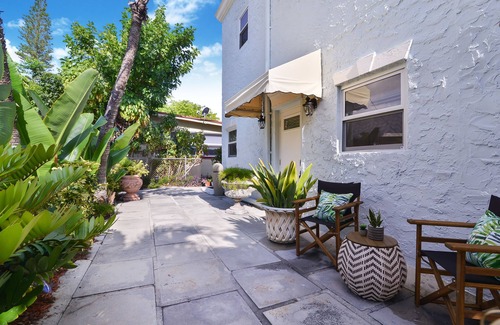 This downstairs modern dwelling is tucked into a tropical yard filled with signature Florida palm trees and lush vegetation. When you arrive, you'll find yourself at the front patio which features comfortable seating and a shaded outdoor dining table. This is the perfect spot to enjoy the beautiful Florida weather during the day and night.