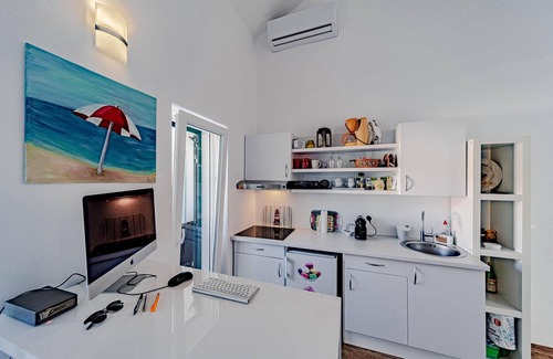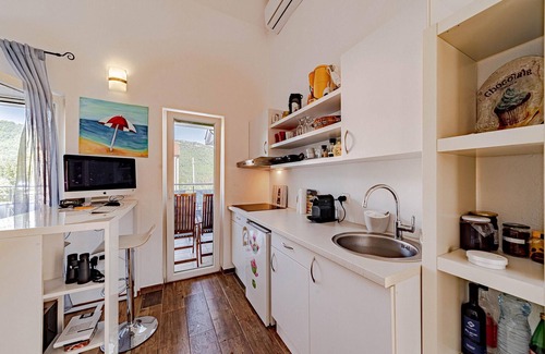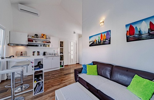 Feel at home from day one in this charming holiday apartment on the Peljesac peninsula in Ston. A light-flooded and cosy living area with comfortable seating and an open, modernly equipped kitchen await you. Thanks to the large windows, you can enjoy a marvellous view of the idyllic, green landscape.