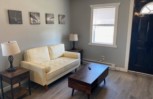 Welcome to our small but powerful one bedroom duplex with an office! This one bedroom duplex offers a queen size bed in the master bedroom, the office has an adjustable desk with a daybed and can be used as a second bedroom, utility room with a full size washer and dryer, and big screen Roku TV in the living room with a comfy couch. The kitchen has a cooktop stove in the island and the microwave doubles as a convection oven. The kitchen is equipped with pots and pans and has everything you need to make basic meals. The kitchen island has bar seating for 2. Note: There is not an oven and has window air conditioning.