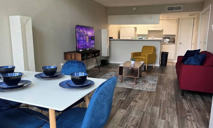 A Mid-century modern Apartment located in a lovely culturally diverse area just 5 minutes away from Houston's ChinaTown, 15 minutes away from The Galleria Mall and 20 minutes away from the AstroDome. You'll never be too far from anything that the beautiful city of Houston has to offer. Enjoy a home away from home stay in this comfy clean townhouse.