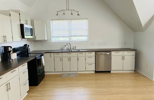 Spacious one bedroom, one bathroom apartment over a completely detached two car garage. This apartment comes equipped with a large bedroom with sitting area and a large open concept kitchen and living room. The kitchen is fully stocked with the essentials you need for cooking and dining. Roku TVs in the living room and bedroom with live streaming Hulu and Netflix. Queen size bed in the bedroom. Washer and dryer within the apartment. Plenty of additional closet space for storage. Covered patio.
