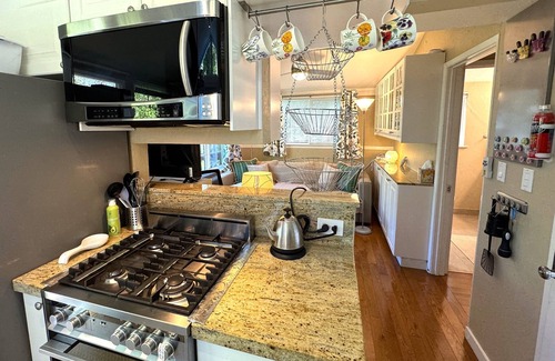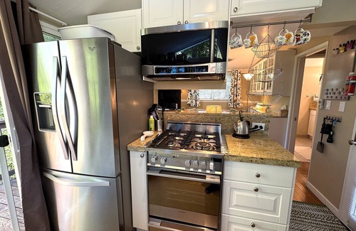 Gourmet kitchen with new stainless fridge with filtered water, new gas stove, granite counters, new cabinetry, gel chef's floor mat, 3 kinds of coffee makers, and all the cookware and gadgets you could ever need. Also close to pizza and other delivery/takeout if you don't want to cook. Have your own full size, front loading washer with dryer too.