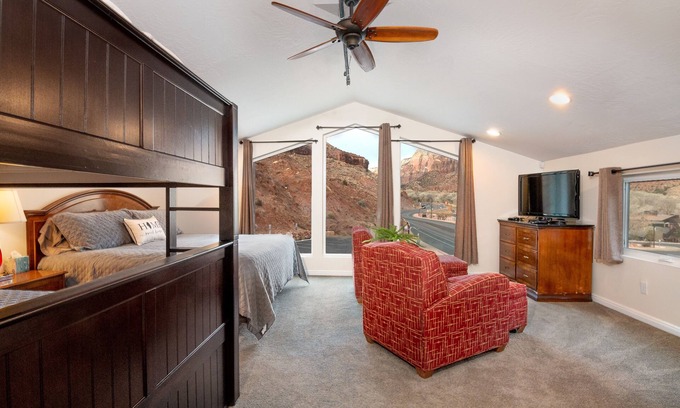 This beautiful apartment has 1 bedroom, 1 bath and a kitchenette/living room. The location offers spectacular views of Zion Canyon. The apartment will sleep 5 adults. The bedroom has 1 king size bed 1 queen size bunkbed set. The living room has a fold out sofa sleeper with memory foam mattress. The kitchen is well stocked with appliances, full size private washer/dryer. You will find anything you need for your stay.